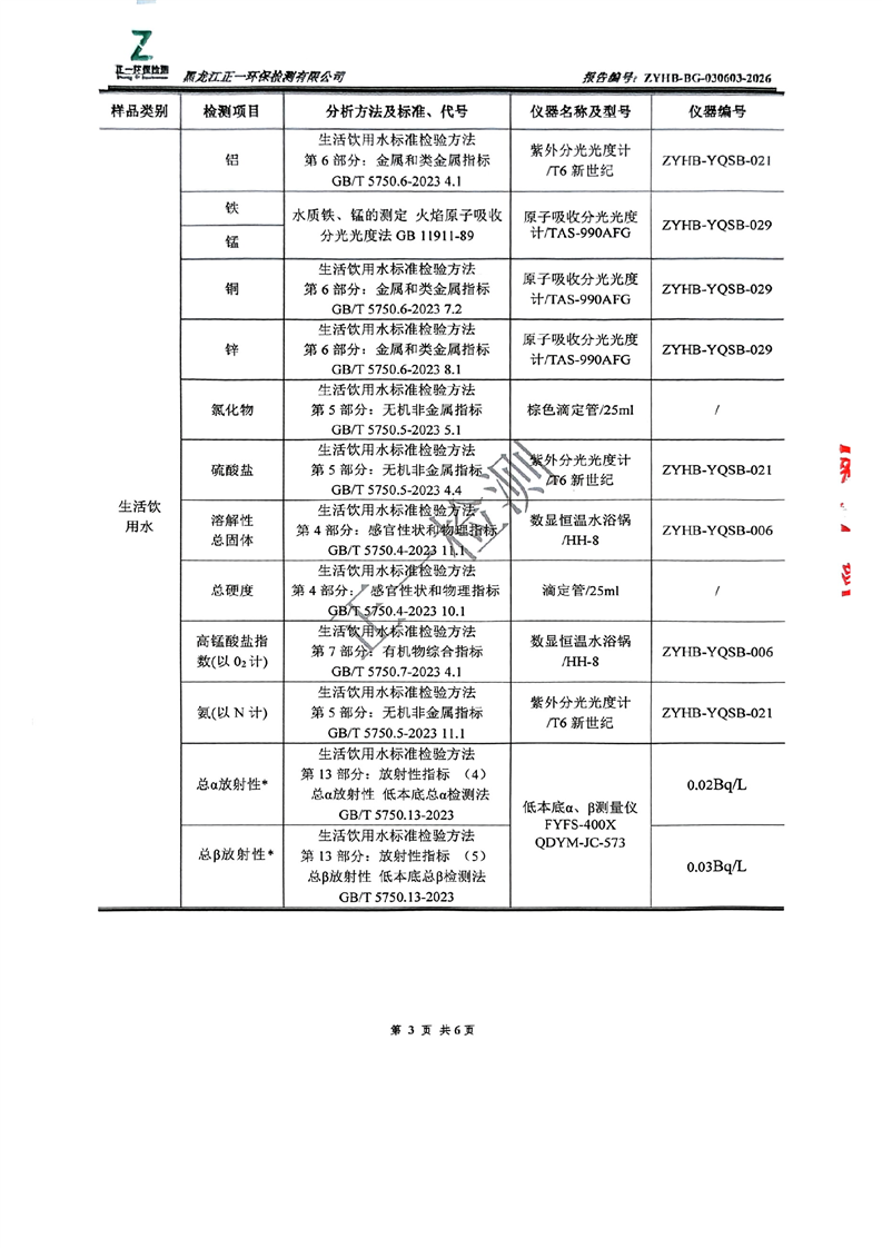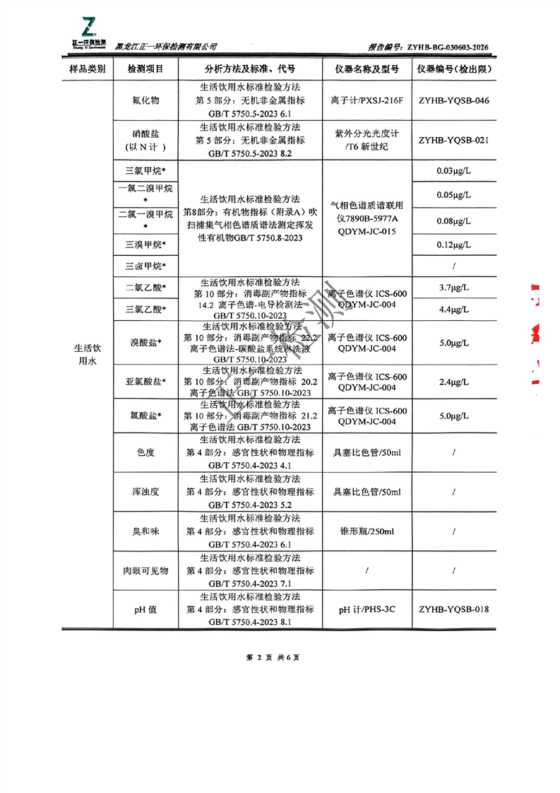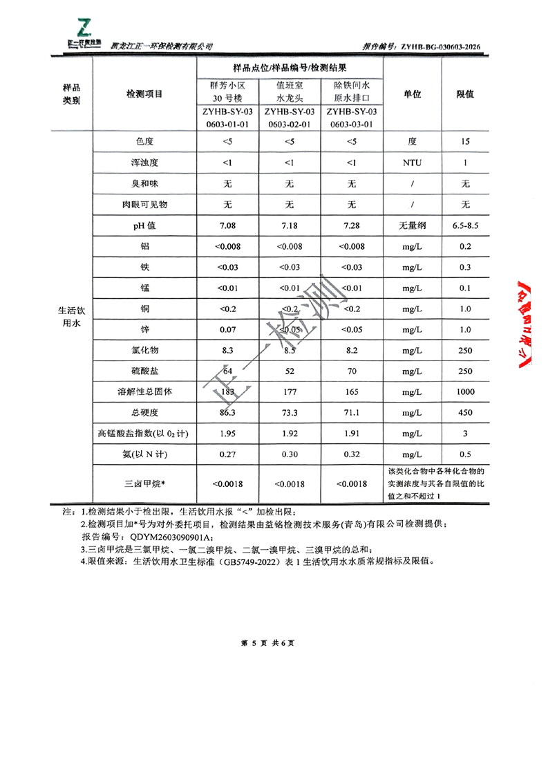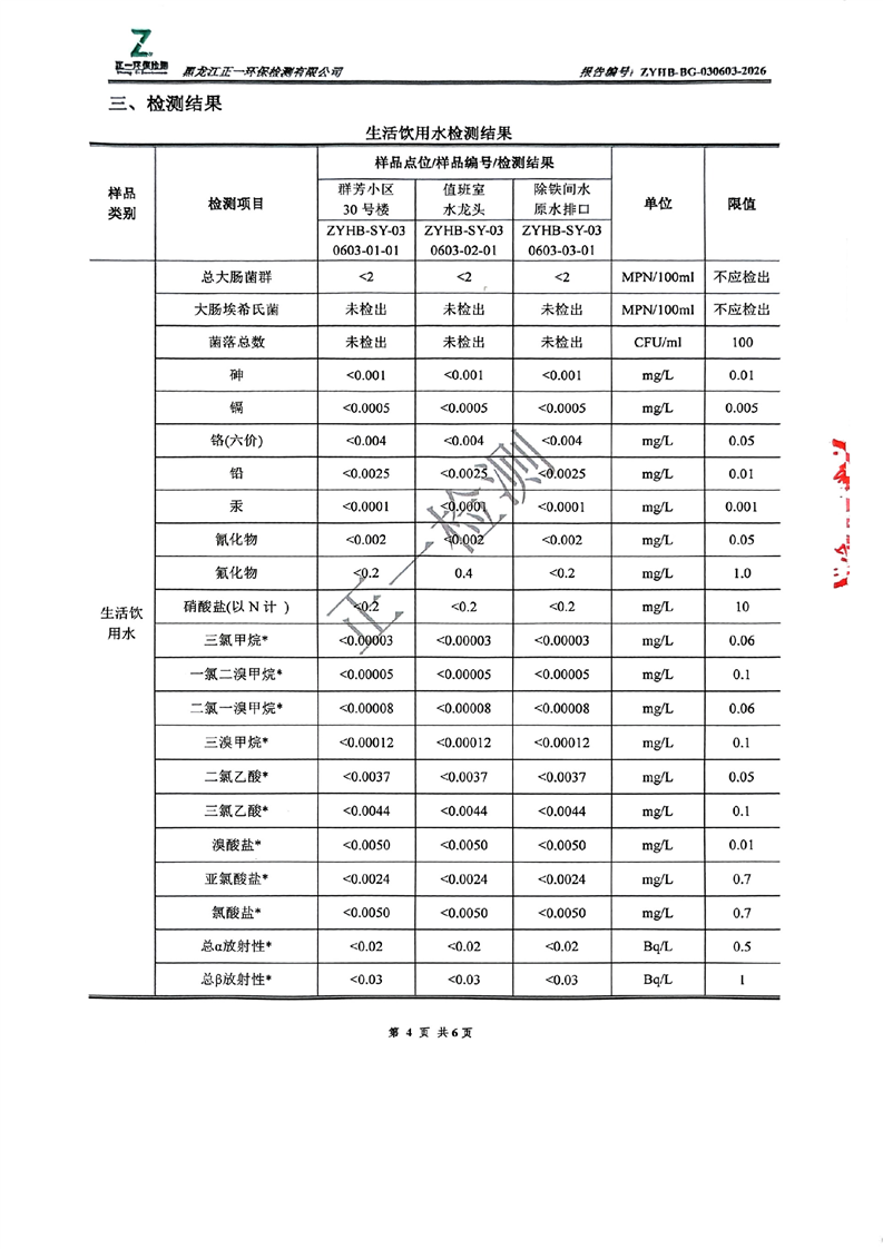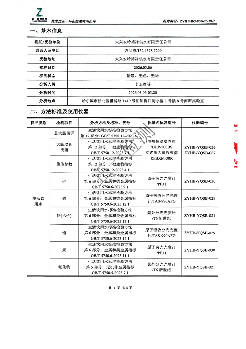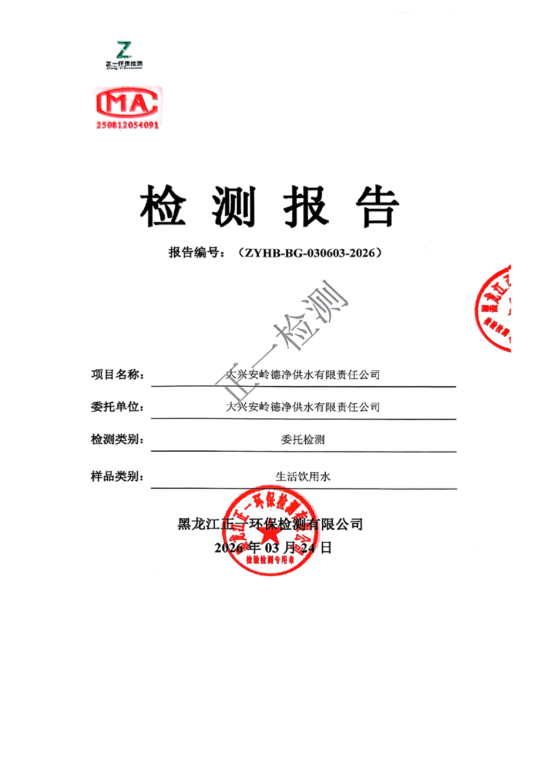 大兴安岭德净供水有限责任公司生活饮用水水质检测报告