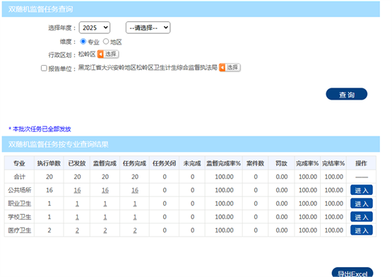 松岭区疾病预防控制中心(卫生监督所)2025年在国家卫生健康监督信息平台抽取双随机监督检测任务共20家:涉及检测项目8家,其中公共场所7家(住宿场所5家、美容美发1家、洗浴1家)、学校1家(松岭区壮志学校);未涉及检测项目的任务12家,其中公共场所9家(宾馆4家、美发5家)、医疗机构3家。已完成现场监督检查及采样检测工作,监督检测项目全部合格。现将录入结果公示如下: